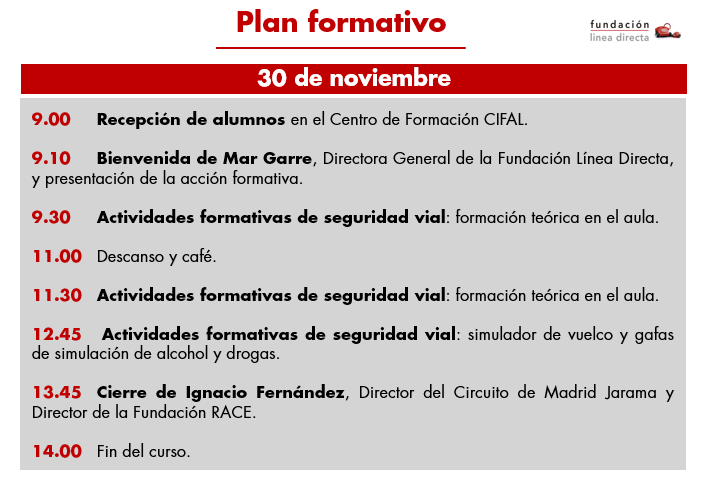 La formación, que será completamente gratuita, se impartirá en colaboración con la Fundación RACE en el centro de formación CIFAL del Circuito de Madrid Jarama - RACE el próximo día 30 de noviembre y contará con 45 plazas que se cubrirán por rigurosa orden de inscripción. El formulario para participar en esta acción formativa es el siguiente: