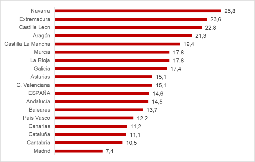En este sentido, Navarra (25,8%) es la región que mayor proporción registra, seguida de Extremadura (23,6%), muy por encima de la media nacional (14,6%). En el lado opuesto se encuentran la Comunidad de Madrid (7,4%) y Cantabria (10,5%).