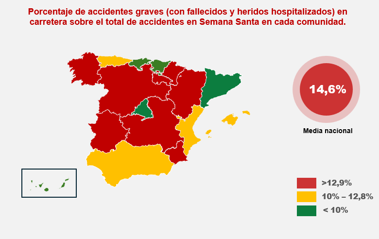 El informe de la Fundación Línea Directa dibuja un mapa donde se refleja la proporción de accidentes graves (con fallecidos y heridos hospitalizados) respecto al total de accidentes ocurridos en Semana Santa en cada territorio.