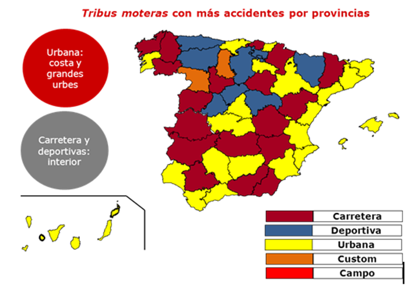 La Fundación Línea Directa ha querido conocer a través de este estudio cuál es la tribu motera con mayor accidentalidad en cada una de las 50 provincias que componen España. En grandes ciudades como Madrid o Barcelona y en las zonas costeras (Valencia, Murcia o Cádiz) la Scooter es la moto con peor comportamiento siniestral, mientras que en las provincias de interior, son las motos deportivas y de carretera las que mayor accidentalidad presentan.