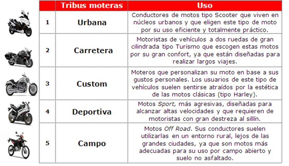 El informe ha dividido a los motociclistas en 5 grandes tribus moteras, dependiendo del tipo de moto que manejan y el uso que le dan. El ranking de las tribus moteras con mayor siniestralidad es el siguiente: